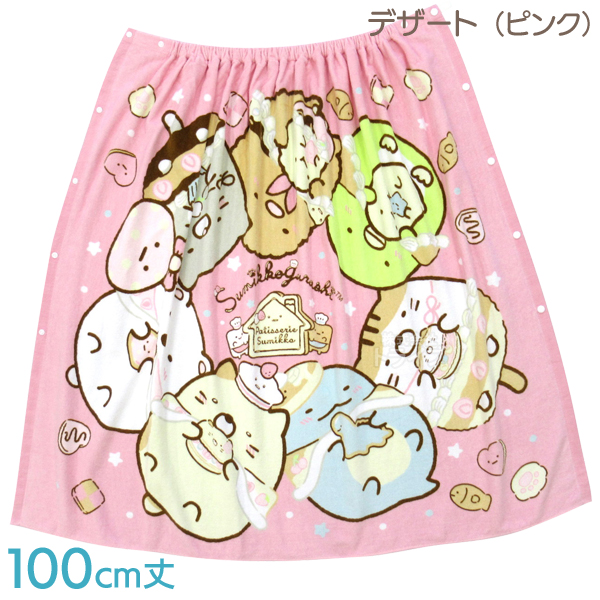 すみっコぐらしのラップタオル(巻きタオル)です。表はシャーリングで滑らかな触り心地、裏は吸収性の良いパイルタオルになっています。授業の水泳・習い事のスイミング・おうちでのお風呂・お出かけなどなど、便利にお使いいただける必須アイテムです!こちらは着丈100cmのロングサイズです。小学校高学年、中学生のお子様や、大人にもオススメ◎個人差もありますので、お子様に合ったサイズをお選びください。