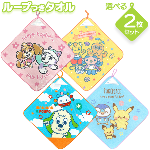 キャラクターのループ付きハンドタオルのお買い得な2枚セットです。お好きなキャラクターを2種お選びください。保育園や幼稚園などで大活躍!タオル上部には名前とクラスを記入できるタグがついています。肌にやさしい綿100%素材です。