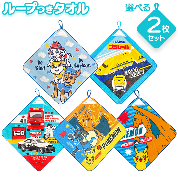 キャラクターのループ付きハンドタオルのお買い得な2枚セットです。お好きなキャラクターを2種お選びください。保育園や幼稚園などで大活躍!タオル上部には名前とクラスを記入できるタグがついています。肌にやさしい綿100%素材です。