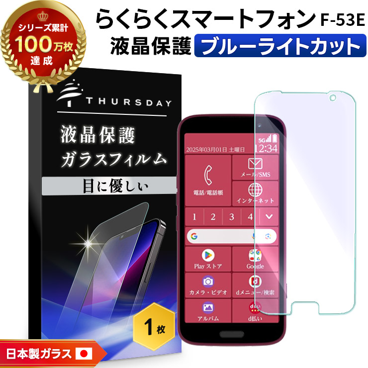 らくらくスマートフォン F-53E ガラスフィルム ブルーライトカット フィルム ガラス スマホフィルム 強化ガラス 液晶保護 指紋 保護フィルム ドコモ f53e FCNT