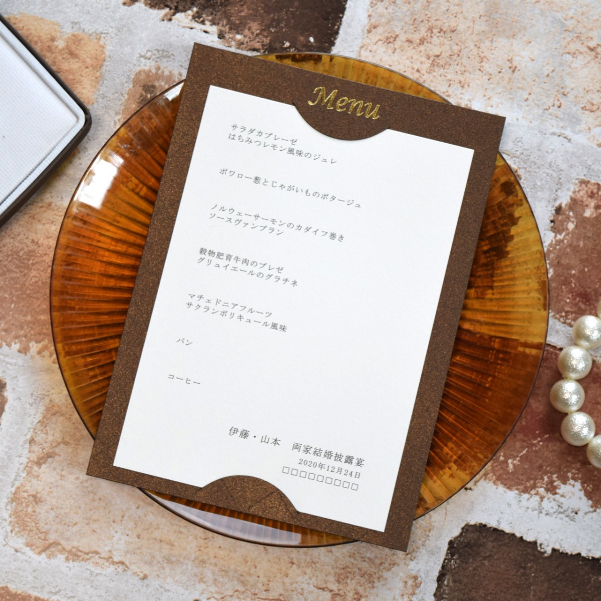メニュー コンプリート ブラウン 結婚式 メニュー表 印刷込み ペーパーアイテム 挙式 披露宴 食事会 当日ペーパー パーティ 一般宴会 祝賀会 謝恩会