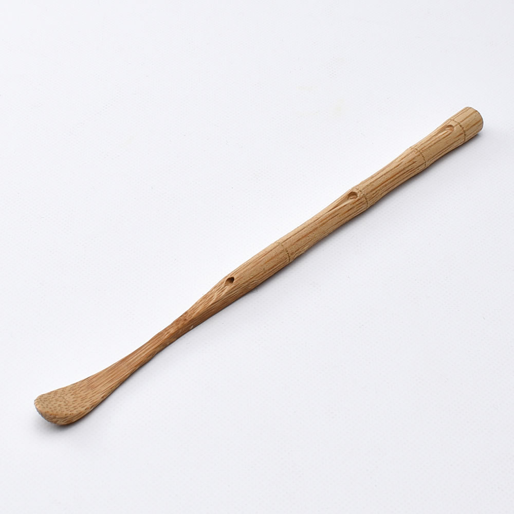茶荷に入れた茶葉を茶壺に入れるのに使う茶匙です。茶葉をすくい上げるのではなく、下向きにして掻き出すようにして使います。柄の部分に節のような装飾が施されたシンプルな茶匙です。