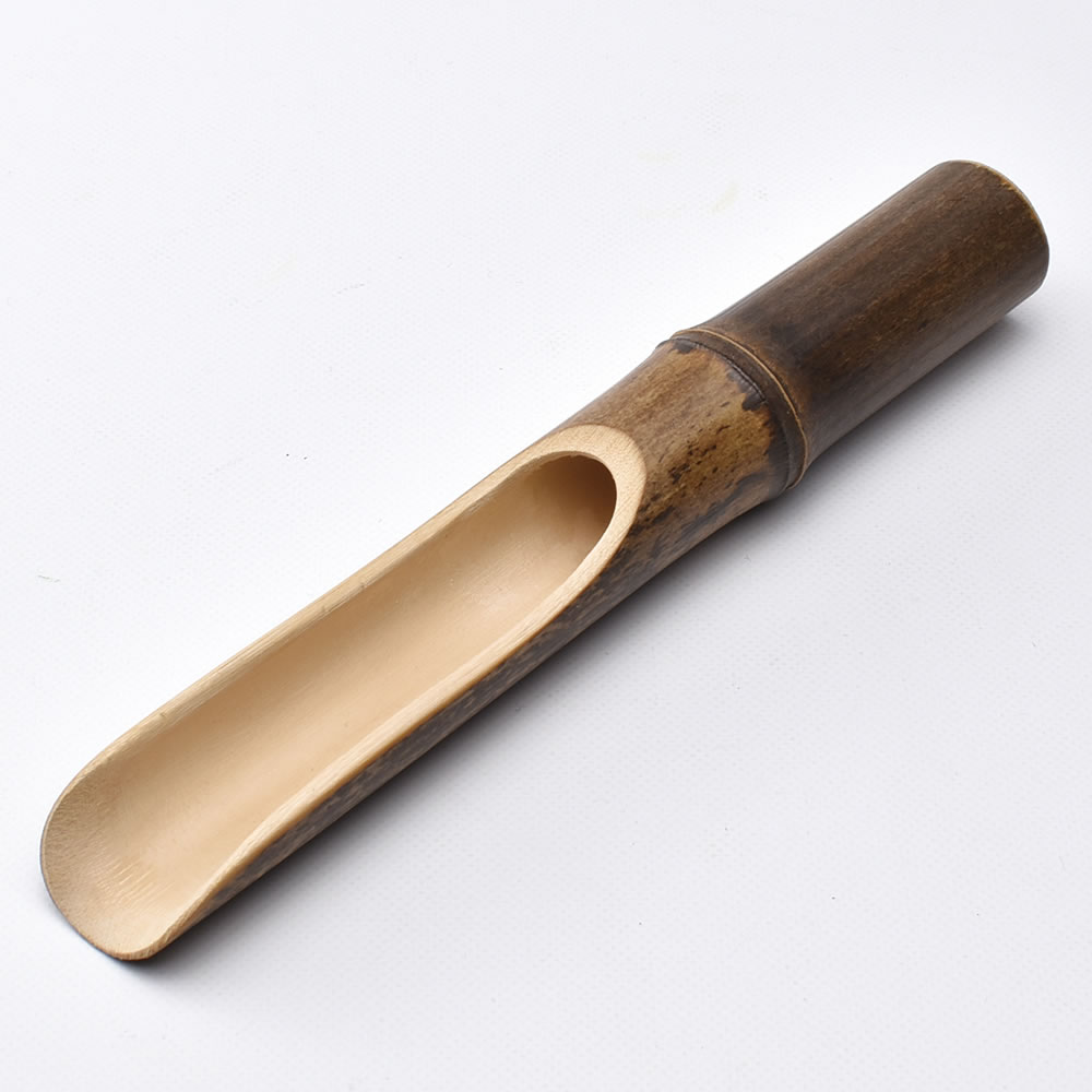 茶缶などから茶葉を取り出し茶荷に入れる際に茶葉をすくう道具です。茶荷を使わない場合はこのまま茶壺へ。スプーンですくうというより茶缶を傾けた上、茶缶と茶葉の間にすべりこませ、のせた茶葉を水平移動で引き出すと良いでしょう。紫竹は成長すると表面が紫がかった黒に変わっていく竹です。