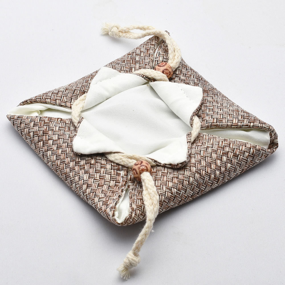 茶壺や蓋碗を入れてヒモをしばると蓋や皿が固定され、お互いにぶつかりにくくなります。底部にスポンジが入っているので、緩衝性能も少しアップした厚口タイプです。大きく編まれた表地と太いヒモが優しい雰囲気を醸し出しています。茶壺の入った写真は、170ml(満水200ml)の清雅壺です。