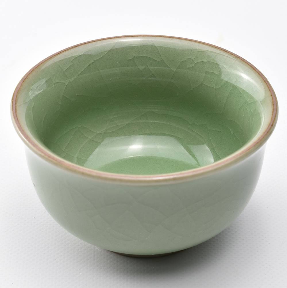 龍泉の青磁には様々な色がありますが、こちらは代表的な梅子青という緑色。古代の哥窯は現存する品が少なく所在も明確にはわかっていませんが、網の目のように入った釉薬の亀裂(貫入)が特徴。古代の哥窯は亀裂が黒くはっきりしたものの方が多いのですが、高度に洗練された芸術品はともかく普段使いとしては馴染みにくいと思い、亀裂の黒くないものを入荷しています。薄さを良しとする磁器とは違い、厚くしっかりした重みがあります。