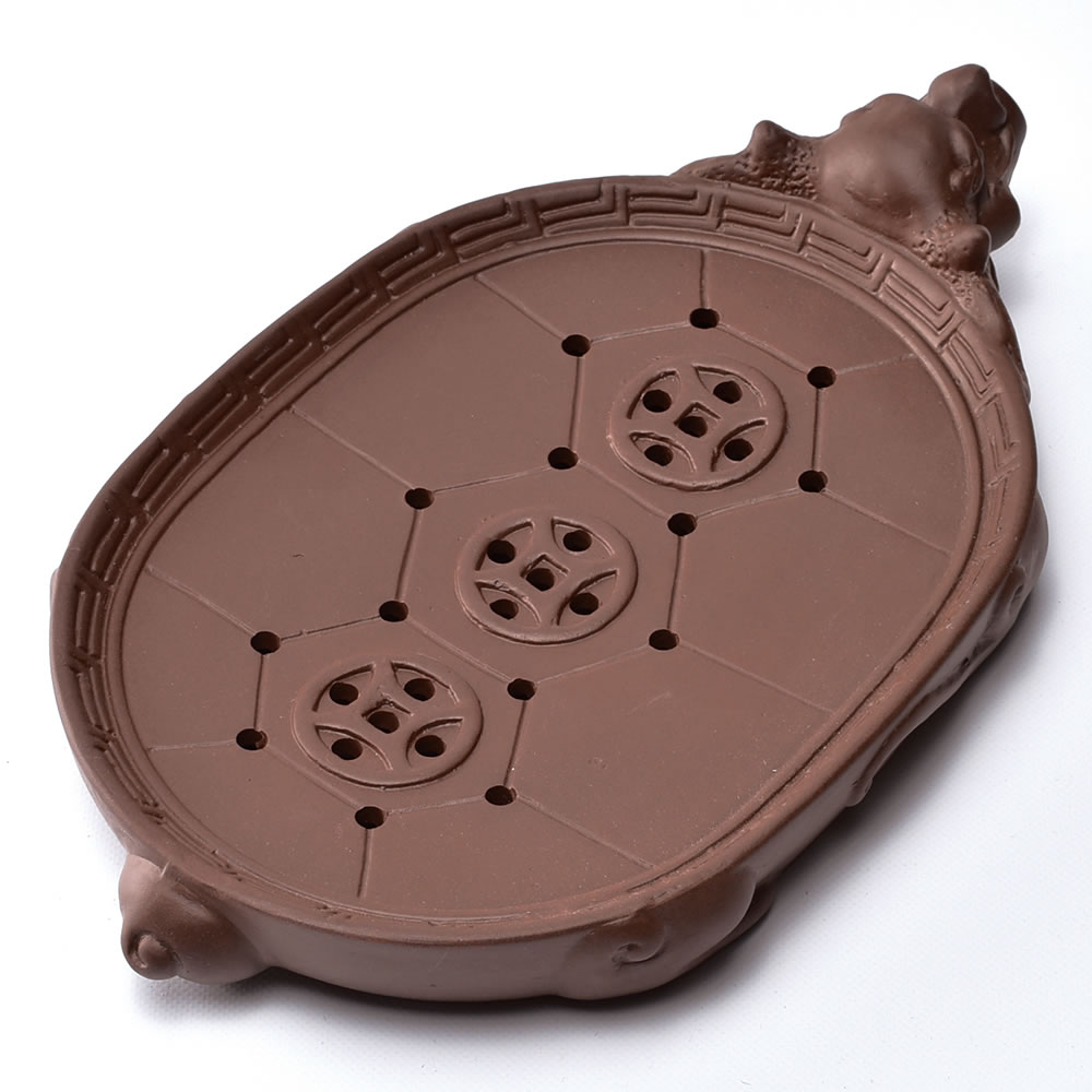 さて、こちらはその紫砂風の茶盤です。蓋を取り外せるタイプではありませんが、中にある程度の水をためることができます。排水は傾けて龍亀の口から水を出します。龍亀は頭が龍で体が亀、龍が生んだ9つの子どものうちのひとつで、厄除けや長寿の象徴とされています。