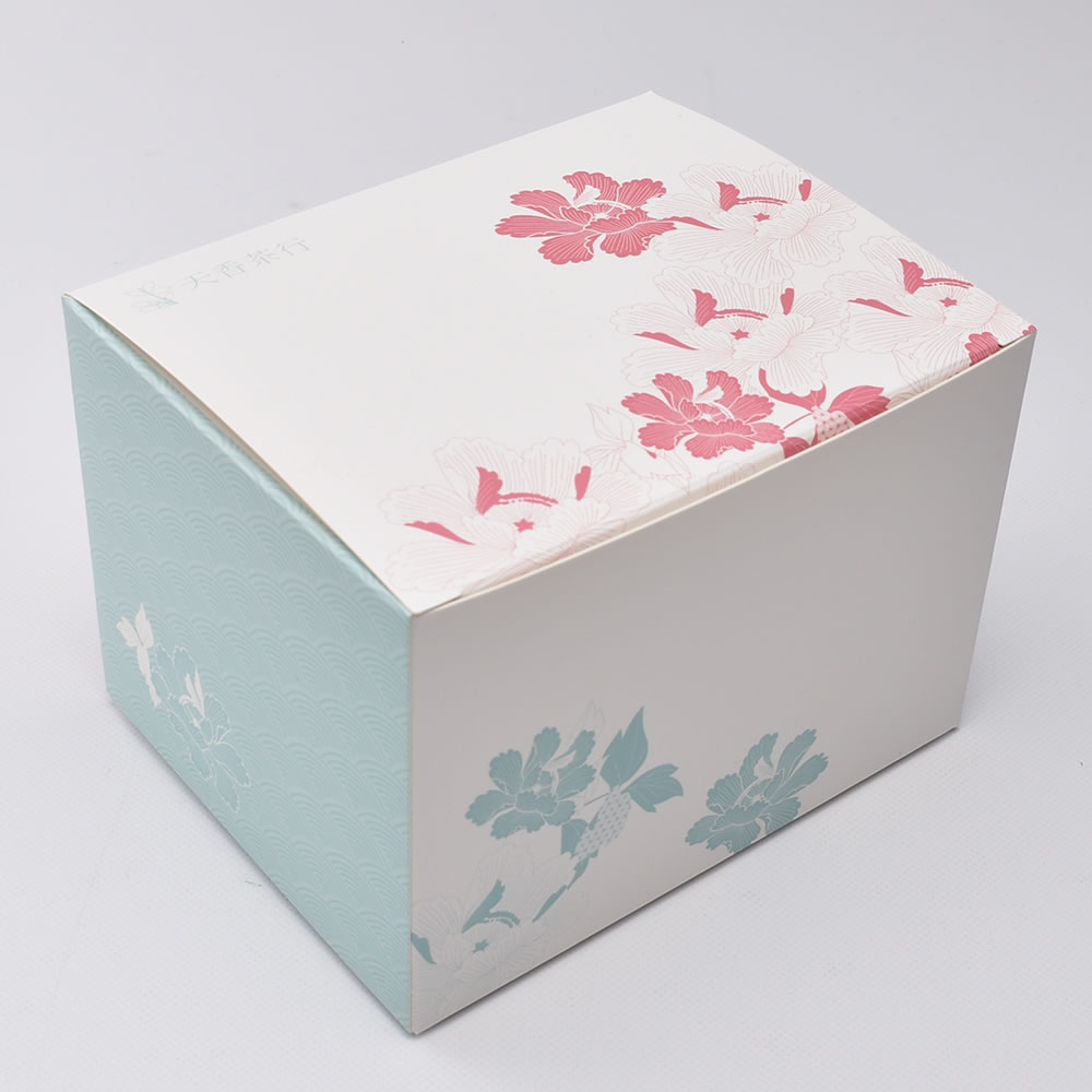 厚手のコート紙、表面は光沢のないマット仕上げの箱です。内容に応じ緩衝材など適宜補って梱包いたします。複数のものをご購入いただき、そのうちひとつをこの箱に入れるといった場合などは、備考にご指示ください。天香茶行の名前が印刷されています。