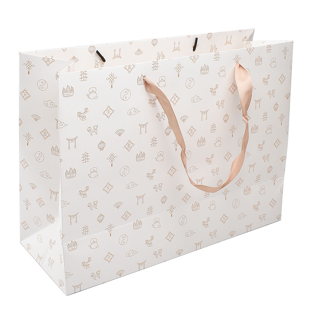 ギフト用の品をご購入いただいた際に便利な紙の手提げ袋です。マットな質感でしっかりとした厚手。図柄は茶壺、祥雲、万里の長城、龍などの中国に関係したややかわいいテイストの小さなイラストと天、香の文字がちりばめられていて、全体としてみると白地に茶色の小紋といった感じです。サイズは幅35×高26×マチの奥行13cm。