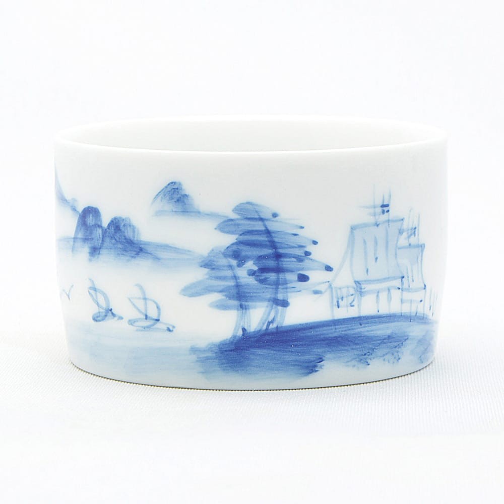 古くから文人墨客に愛された茶。清らかな風景との結びつきは特に深いものがあります。こちらは近景に人家、遠景に水面に浮かぶ舟、山々を描いた杯です。