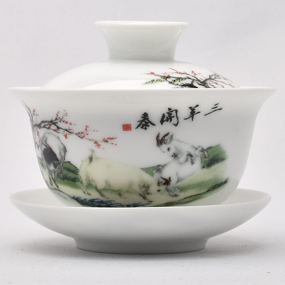 こちらは三羊開泰を落ち着いた色彩で図案とした蓋碗です。