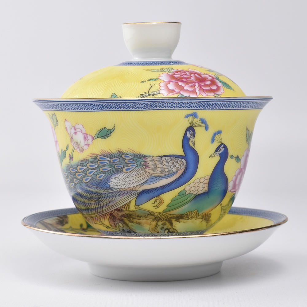 さて、こちらはそうした清の時代の傑作ともいえる磁器の雰囲気を現代の技術でリーズナブルに模倣したものです。花の中の王と呼ばれる牡丹の花に二羽の孔雀というゴージャスな図柄、黄色は清代の皇帝が使う色。金(令の右に羽という字)玉羽の4文字は、金の羽、玉の羽という意味で、孔雀の図案を指し、軌道風の模様をよく見ると孔雀の羽の形の模様になっています。縁などには金色の縁どりが施され、なかなか華やかな蓋碗です。