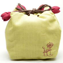 茶壺1と茶杯4つが入る中綿の入った布袋です。茶器の持ち運びや保管に便利で、茶器を保護してくれます。写真は茶器を入れた状態ですが、日本に来るまでにつぶれてしまい、茶器を入れない状態だと、つぶれた感があります。色はモニタによって変化しやすい微妙な色ですが、くすんだ黄緑色、または、青みがかったベージュといった感じです。
