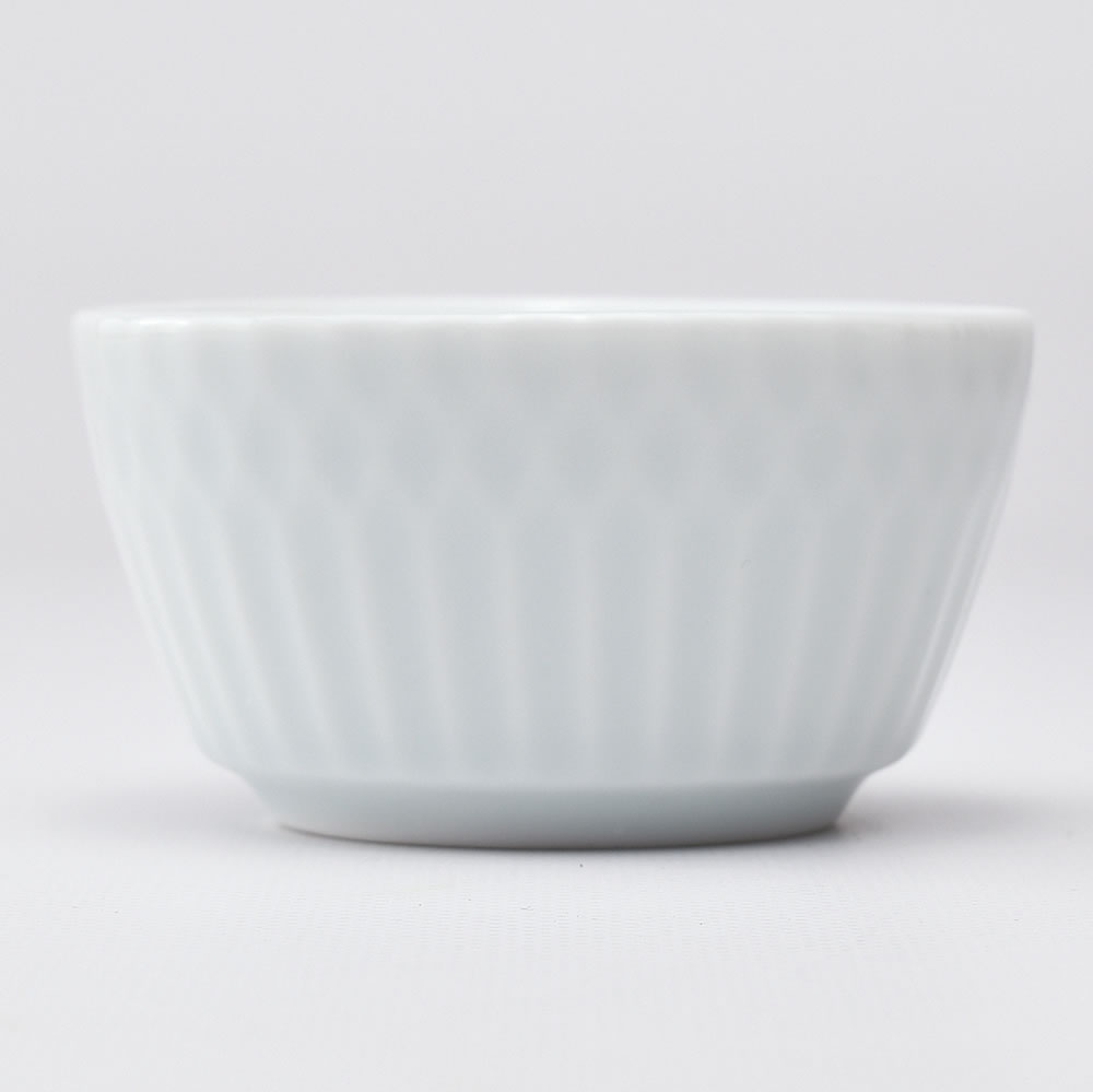 鎬(しのぎ)とは日本刀の側面の、刃と背の間の山高くなっている部分=稜線のことです。激しく争うことを意味する「鎬をけずる」という言葉はここから来ています。陶磁器における鎬とは、ヘラで均等に削っていった際にできる稜線の文様、その器のことを表します。こちらは鎬の文様をイメージして作られた涼やかな小杯です。
