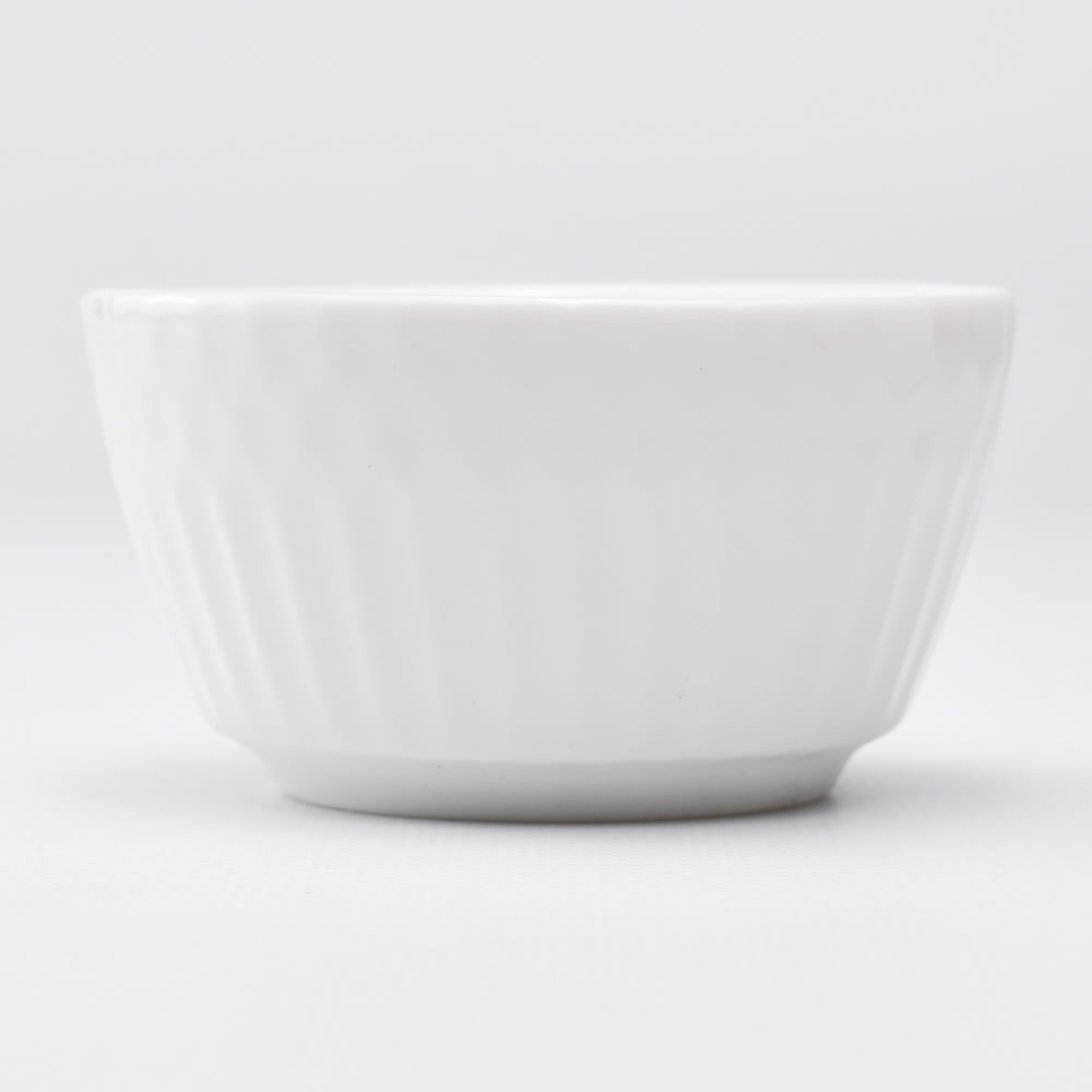 鎬(しのぎ)とは日本刀の側面の、刃と背の間の山高くなっている部分=稜線のことです。激しく争うことを意味する「鎬をけずる」という言葉はここから来ています。陶磁器における鎬とは、ヘラで均等に削っていった際にできる稜線の文様、その器のことを表します。こちらは鎬の文様をイメージして作られた涼やかな小杯です。