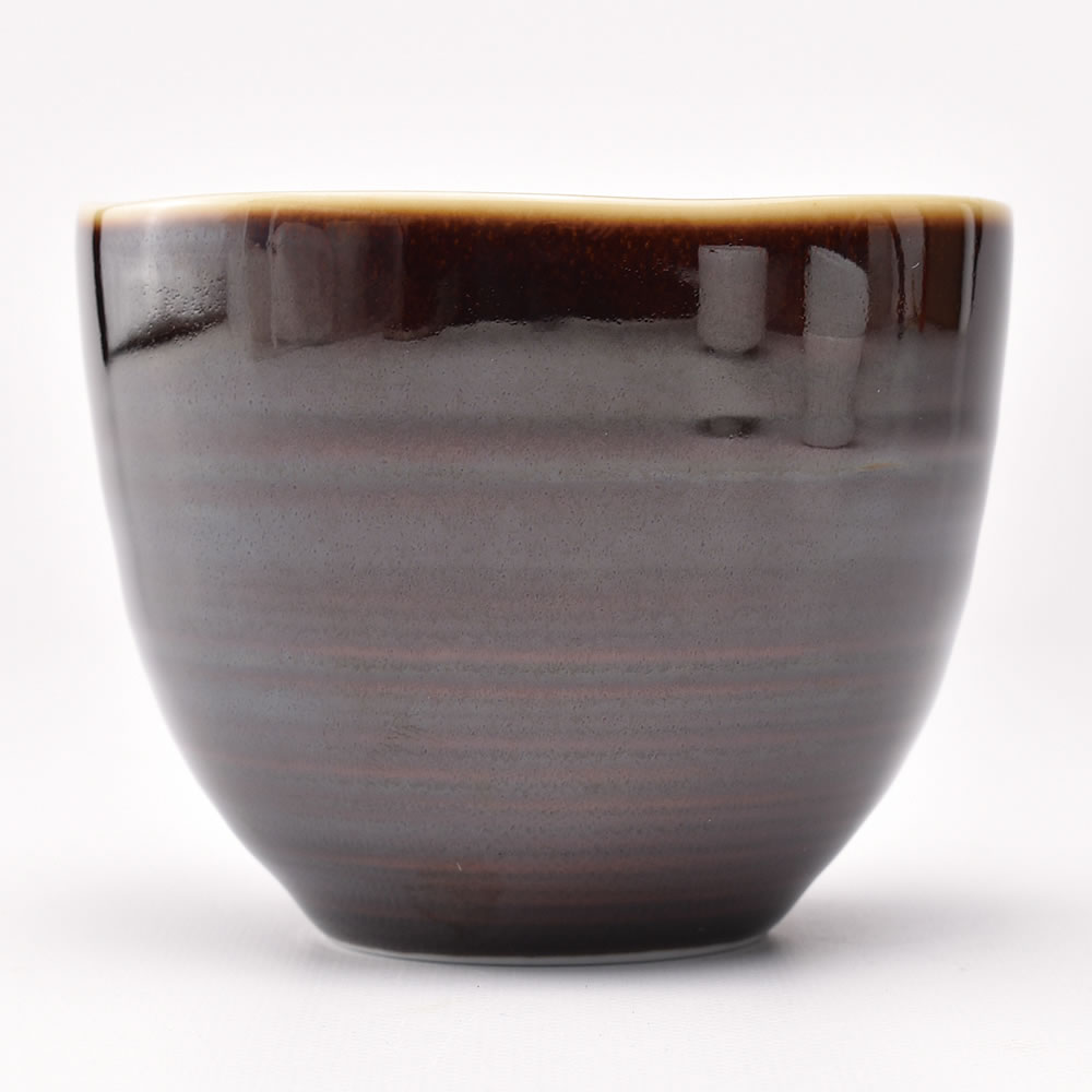 こちらはその瑞浪の磁器茶杯。櫛で引いたような横のラインは凹凸があり、その上に濃いアメ色の釉薬をかけることで色の濃淡が生まれています。元は白磁なので口に当たるフチの部分は釉薬が薄く白く、よく見るときれいな円ではなく意図的な歪みが加えられているのも、面白みとなっています。