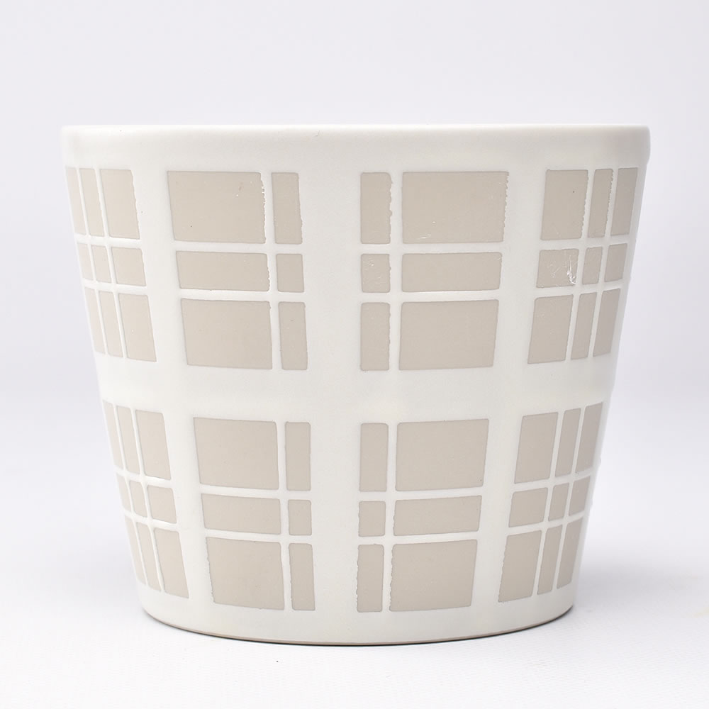 図案は様々な国のテキスタイルに着想を得たとのことで、こちらはイギリスをイメージしたチェックです。こってりとした厚手の釉薬から再生土の生地が顔をのぞかせて模様となっています。気軽にティーバッグを使うのにも頃合いの大きさです。
