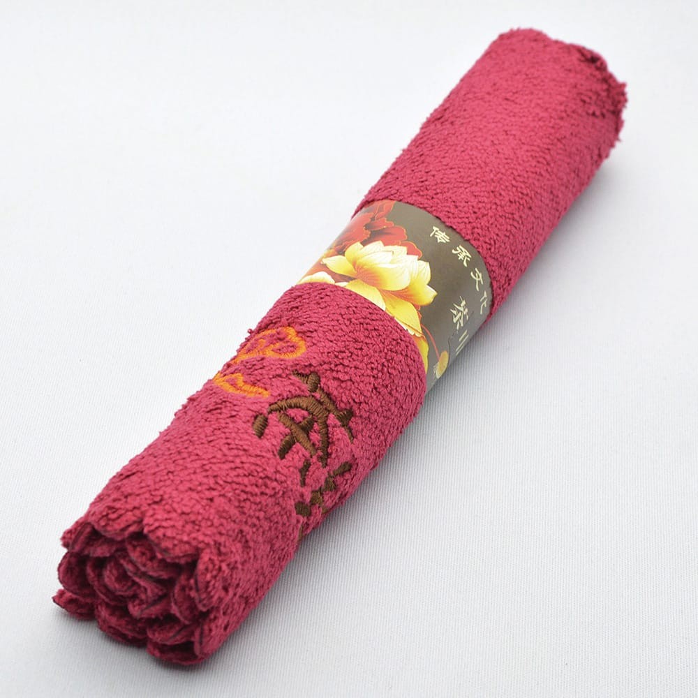 茶経とは茶聖と呼ばれる陸羽が唐代に著した世界最古の茶書のこと。茶経の文字と雲の図案がかわいらしい厚手の茶巾です。こちらはワインレッドタイプです。