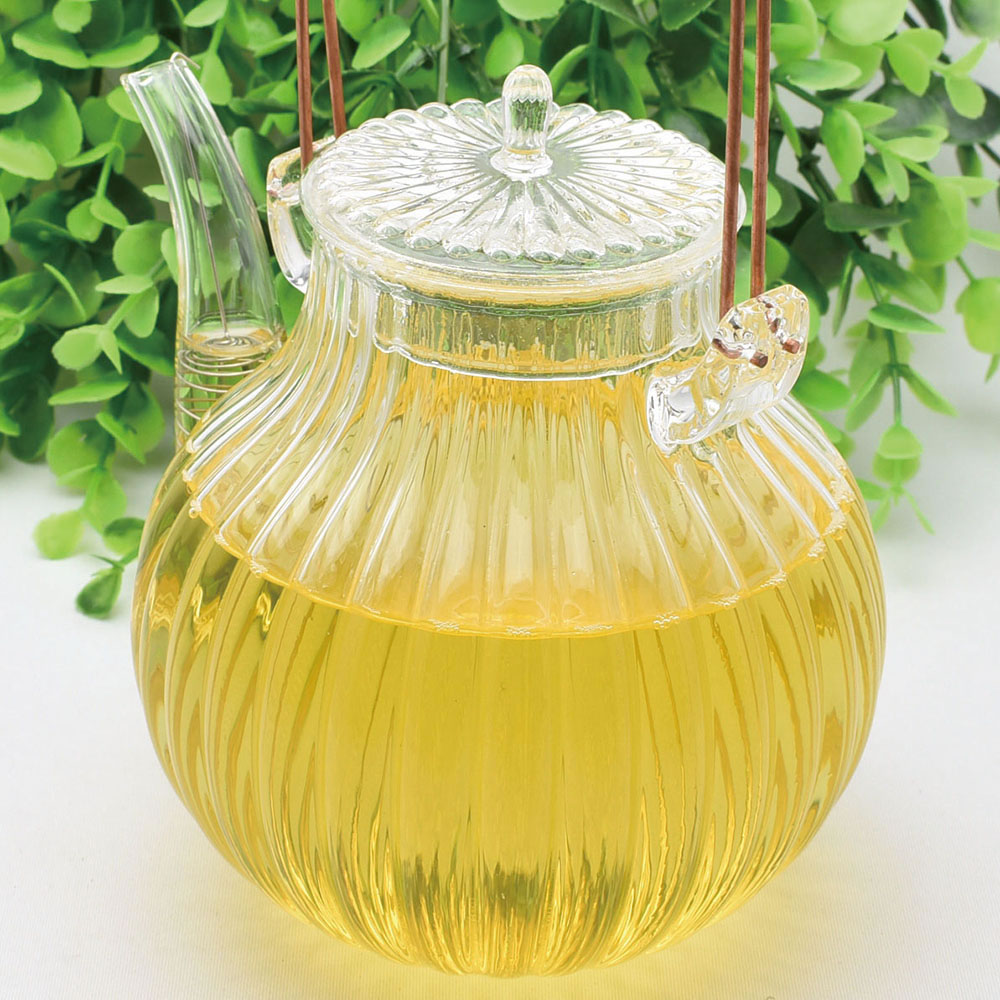 縦のラインがくっきりと印象的。銅色の直角の持ち手がレトロな雰囲気を醸し出す耐熱ガラスのティーポット。容量も大きめで、なかなかしっかりとした造りです。大人数での会食時にも十分なサイズ、見た目に美しく存在感のあるポットです。紅茶・緑茶・烏龍茶、なんでも似合う雰囲気もお薦めです。