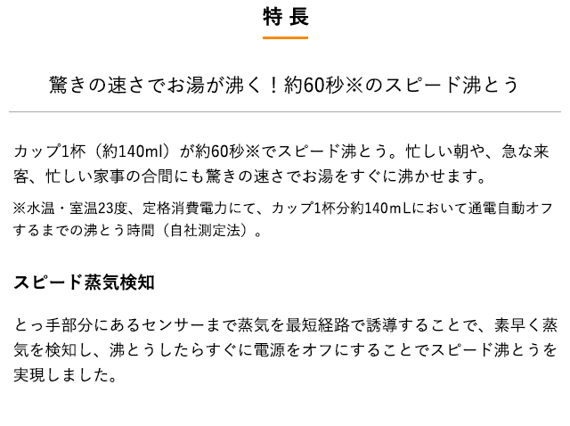カップ1杯約60秒でお湯が沸くので、使いたいときに使う分だけすぐにお湯が沸かせます。