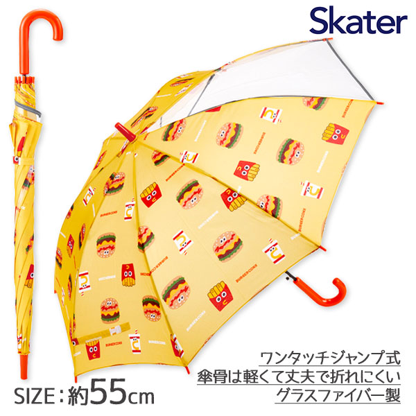 【商品詳細】ポップなバーガーコンクス柄の子ども用長傘。ワンタッチで開けるジャンプ式で使いやすく、丈夫なグラスファイバー骨を採用。前が見える透明窓と反射テープ付きで安心。