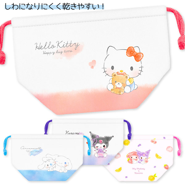 【商品詳細】サンリオキャラクターがかわいくデザインされたランチ巾着です。皺になりにくく乾きやすい素材を使用しているので、お手入れも簡単で衛生的にお使いいただけます。