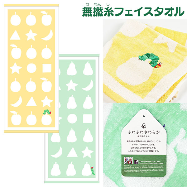 【商品詳細】大人気絵本『はらぺこあおむし』デザインのフェイスタオルが登場!無撚糸(むねんし)を使用しているので、空気をたっぷり含み、ふわふわでやわらかな肌触りです。