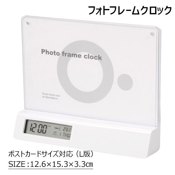 【商品詳細】シンプルなデザインのフォトフレームです!ポストカードサイズ対応。時刻表示・カレンダー・アラーム・スヌーズ・温度計と機能充実。