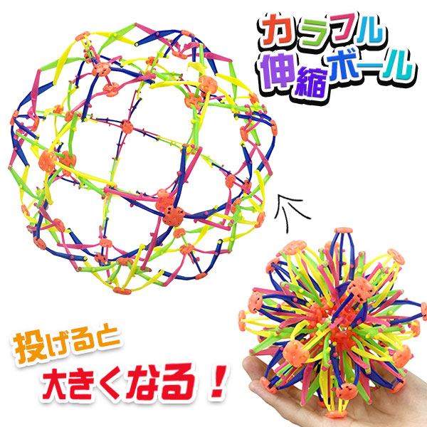 【商品詳細】カラフルなデザインが楽しい!不思議な仕組みで伸縮するボールです。小さく縮めて手のひらサイズに、投げたり引っ張ったりすると一気に大きく広がってインパクト抜群!