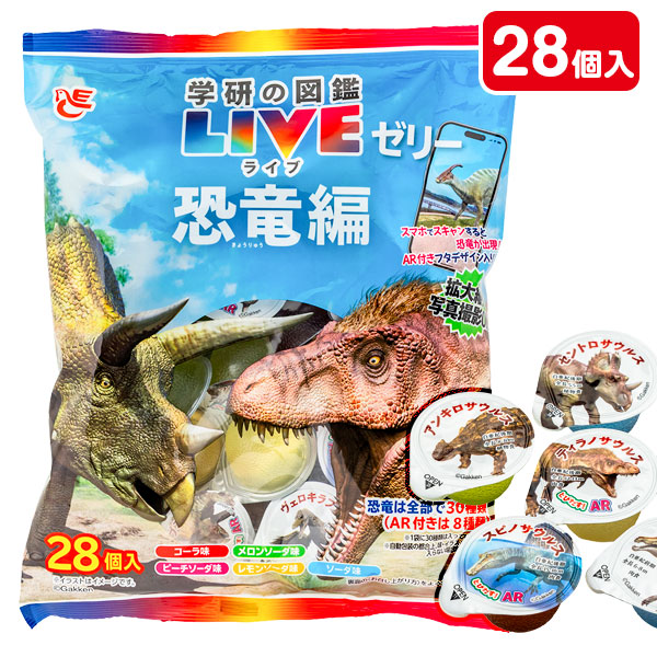 【主な仕様】1組1セット|内容量:15g×28個入(約412g)|恐竜は全30種類(AR付き8種類)|アレルギー物質:りんご(コーラ味・メロンソーダ味)、もも(ピーチソーダ味)|賞味期限:製造日より180日|※賞味期限は商品到着日より1ヶ月以上ある商品を出荷しています。(催事商品及び一部地域を除く)|※複数ご注文いただいた場合、賞味期限が全て同じ日付の物でお届けできない場合がございます。|※原材料・アレルギー表示は変更する場合がございます。