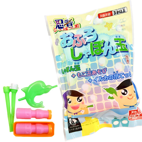 【主な仕様】1ヶ1セット|おふろのコミュニケーションツールとして遊べる|水てっぽう(イルカ)1個・吹き棒1本・アタッチメント付き吹き棒1本・ミニトレー1個・シャボン玉液2本|日本製|対象年齢3歳以上|個包装|重量:約78g