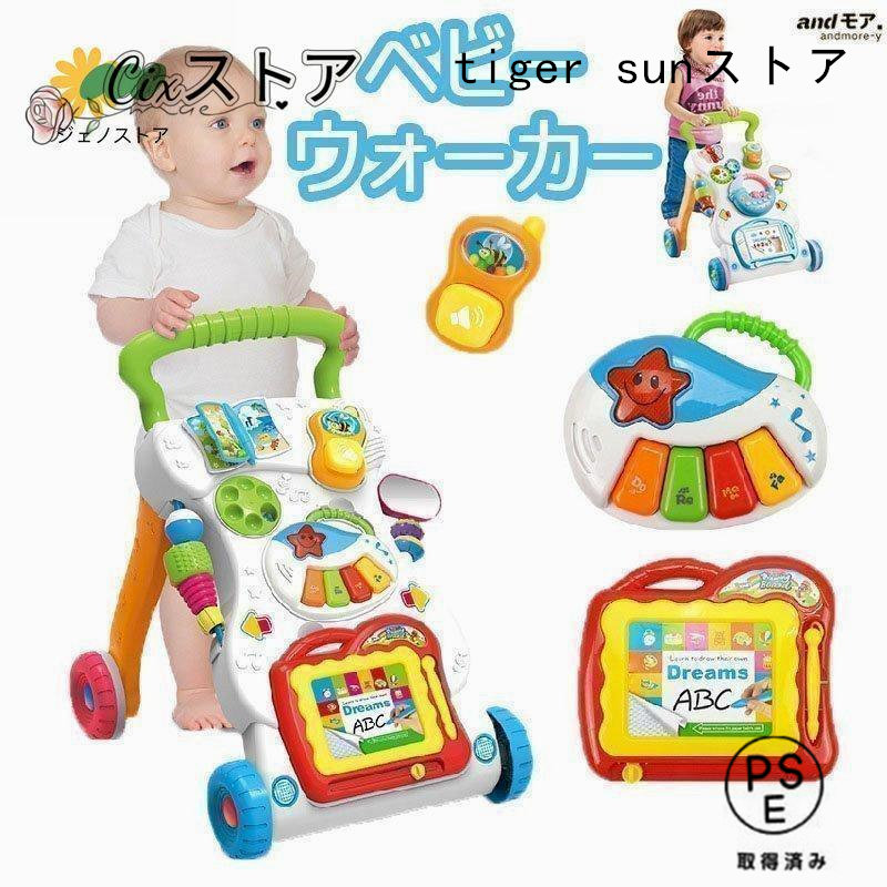 ※「つかまり立ちやあんよの練習」を応援するベビーウォーカーです。手押し車と知育トイ( 本、携帯、回転ダイヤル、ミラー、鍵盤、お絵描きボード ) が合体した歩行器です。