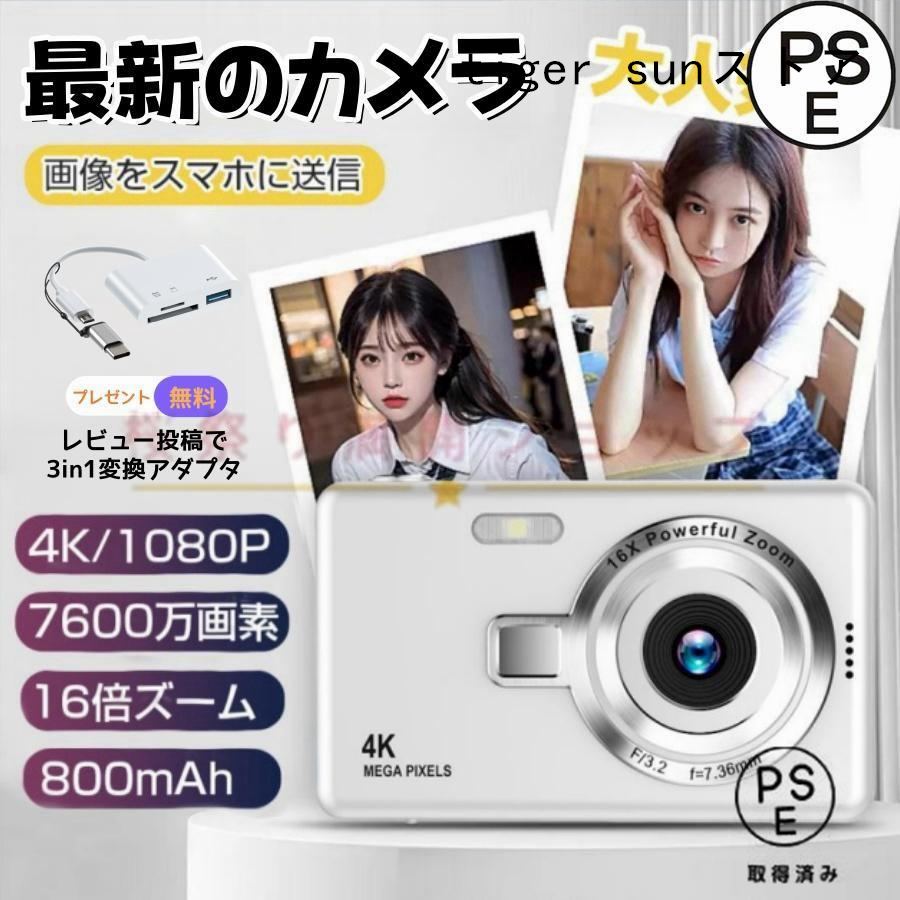 デジカメ デジタルカメラ 4K 7600万画素 16倍ズーム 高画質 オートフォーカス ウェブカメラ機能 手振れ補正 IPS大画面 防塵 軽量 初心者