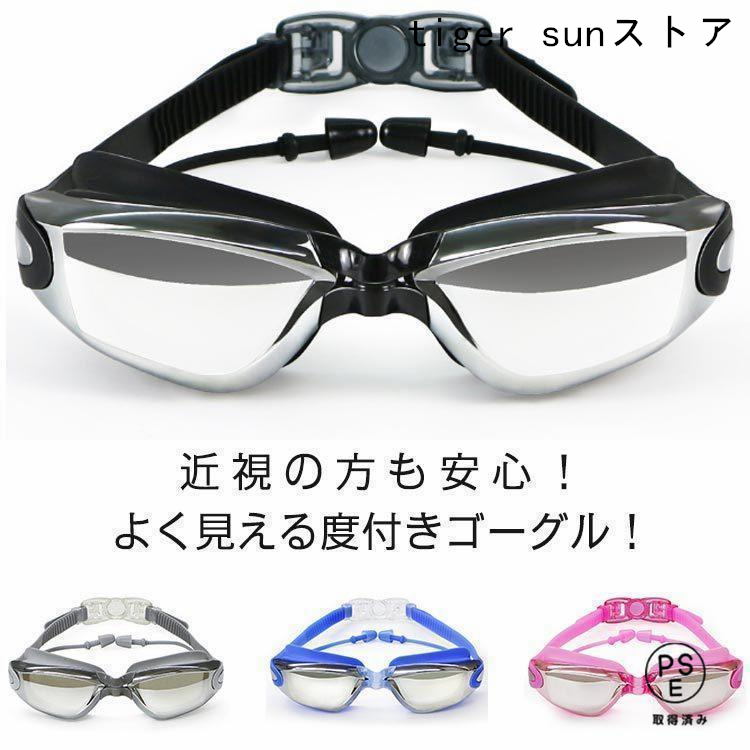 ミラーゴーグル 度付き スイミング ゴーグル 耳栓付き 水中メガネ 一体化耳栓 水泳 大人用 スイムゴーグル くもり止め UVカット 度入り 近視用