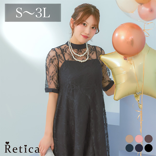 パーティードレス 結婚式 ドレス 20代 30代 40代 50代 親族 フォーマルドレス ロング フレア 3点セット レース パール ネックレス付き 半袖 2L 3L 大きいサイズ