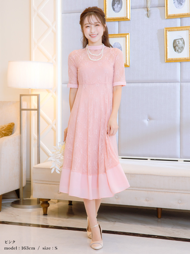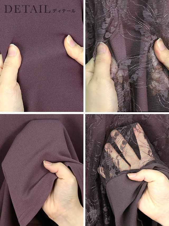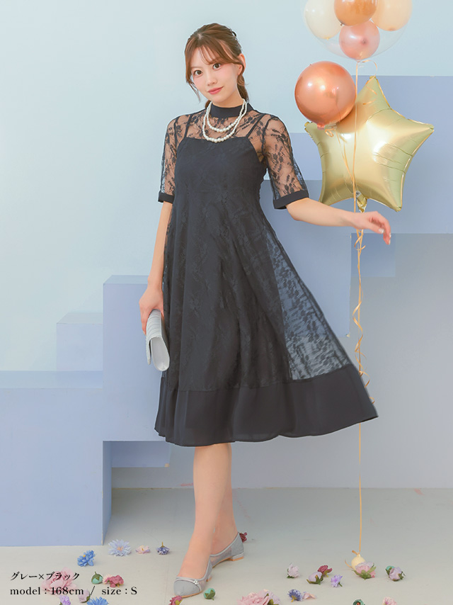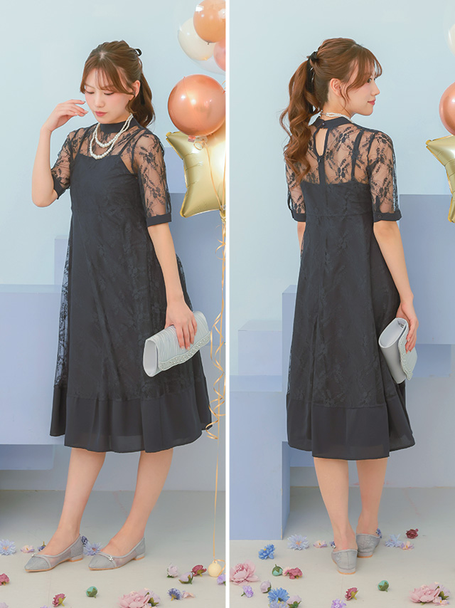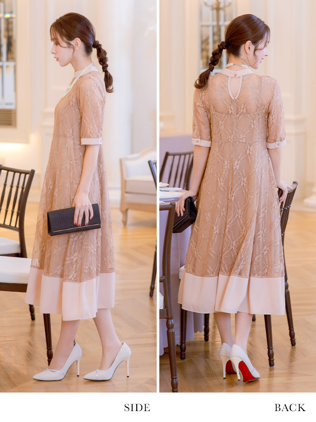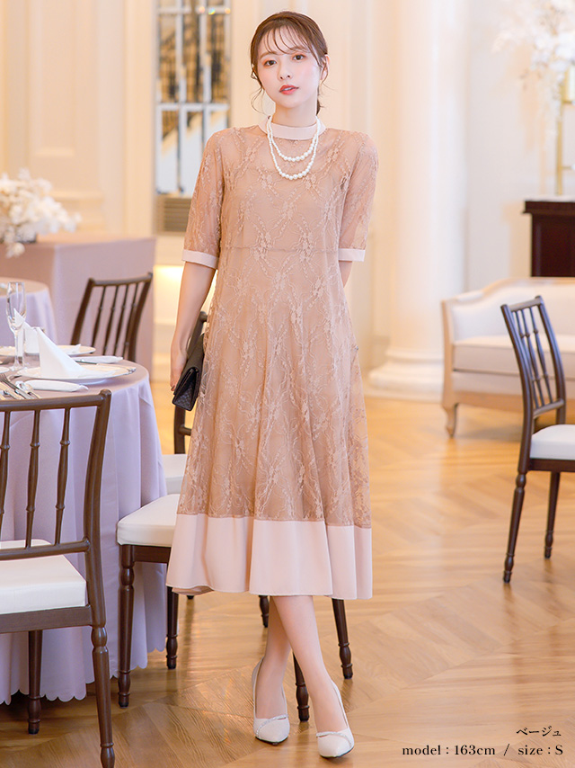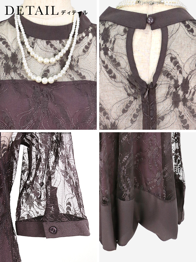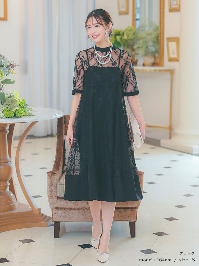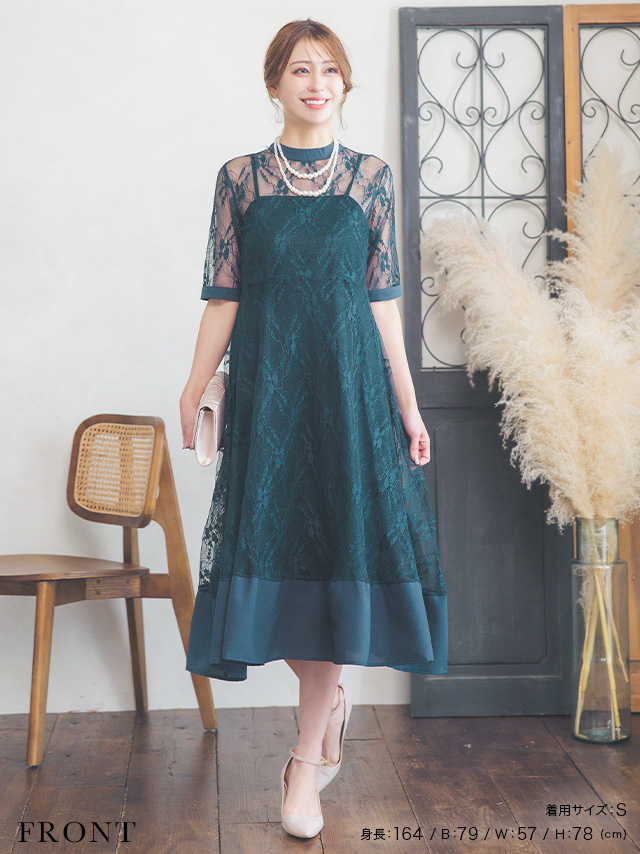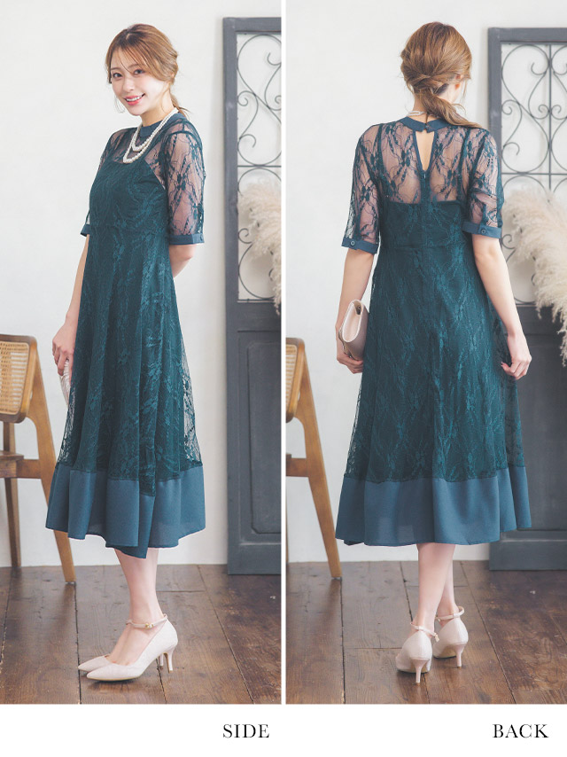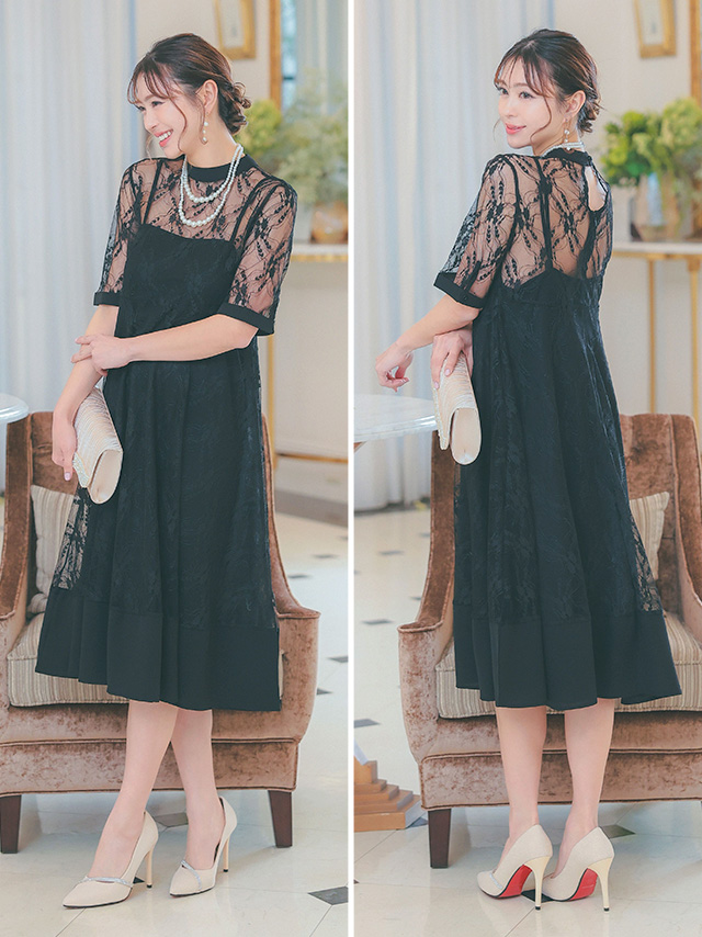 レーススリーブ&ミモレ丈で体型カバーも叶い、パールネックレスで華やかさも演出します♪