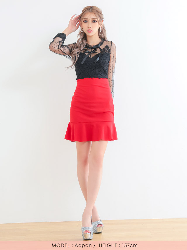 ■5:レースリボンゴールドボタン長袖ミニドレス