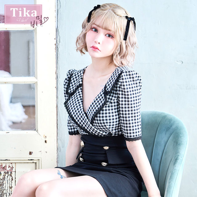 [TikaPimil] キャバドレス 韓国 ギンガムチェック 半袖 レース テーラードカラー タイト ミニドレス 膝丈 黒 タイトドレス