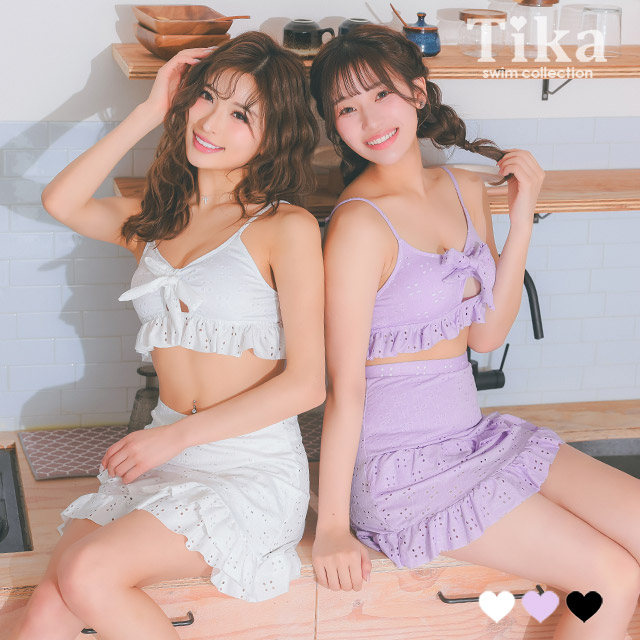 水着レディース 水着 ビキニ ショルダー エンブロイダリー レース カットアウト リボン ビスチェ 体型カバー フリル ラップスカート 韓国風 ガーリー タンキニ