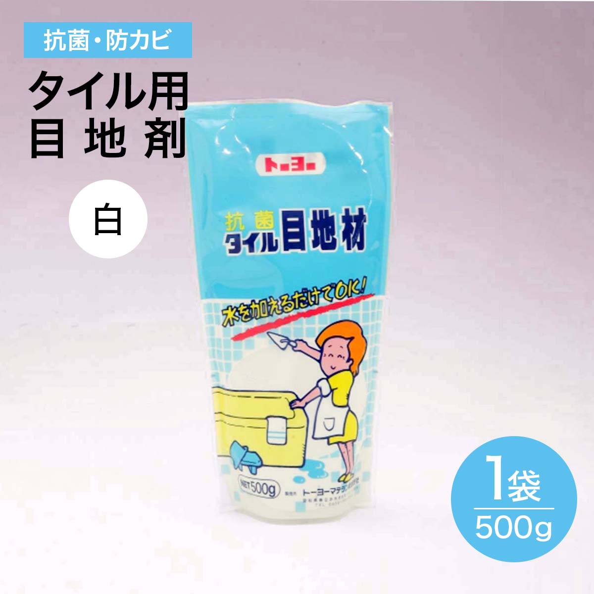 備考 | 〇 水を加えるだけで作業できます。 〇 防カビ剤配合によりカビの発生をおさえます。 〇 可使時間:15分 〇 内外装のタイル目地補修・ひび割れ補修など。 〇 ポルトランドセメント、シリカサンド、急結剤、防カビ剤 〇 硬化時間は20℃で約4時間 |