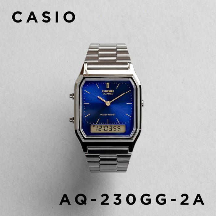 商品の本体に小キズがあります。商品自体は未使用品です。 カシオAQ-230は、1980年代に隆盛を極めたアナデジ・ウォッチの系統を引き継ぐ、伝統的な腕時計です。モデルチェンジの過程で秒針が省略されてしまいましたが、これは退化ではなく、エレガントな2針のドレスウォッチに進化した、と受け止めたほうが良いでしょう。デジタル部には秒も表示されますから、秒単位で時刻を確認することも可能です。デュアルタイム機能も備わっているので、他都市の時刻を表示する、ワールドタイムとしても使えます。 | |