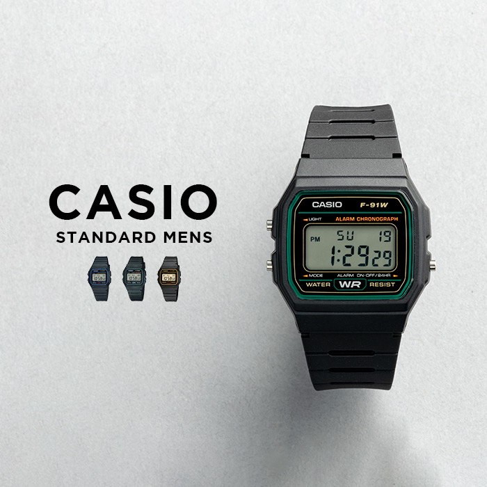 | ■ カラー ■ F-91W-1 ケース:ブラック 文字盤:ブラック / ブルー ベルト:ブラック F-91W-3 ケース:ブラック 文字盤:ブラック / グリーン ベルト:ブラック F-91WG-9 ケース:ブラック 文字盤:ブラック / ゴールド ベルト:ブラック →他のカラーはコチラ | |