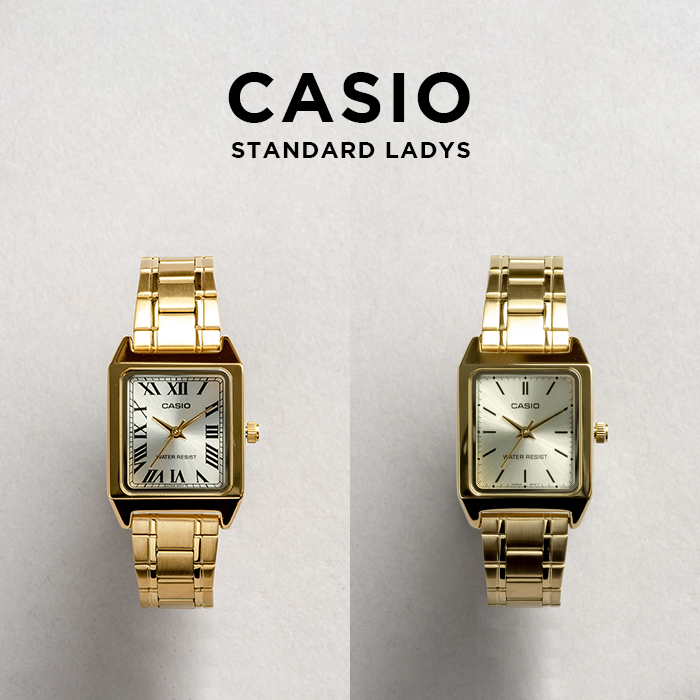 カシオLTP-V007は、クラシカルな角型フェイスで、文字盤にも落ち着きが感じられるデザインです。商品構成は大きく分けて、ベルトの素材が異なる2ライン(合成皮革とステンレス)。更に、それぞれのラインに、文字盤のデザインが異なるバリエーションモデルが展開されています。この腕時計のゴールドは上品な風合いで、ギラギラ感が極力抑えられています。ドルフィン針という名の、菱形の針が採用されており、クラシカルさをより一層引き立てています。 | |
