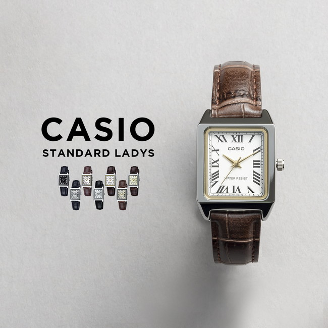 カシオLTP-V007は、クラシカルな角型フェイスで、文字盤にも落ち着きが感じられるデザインです。商品構成は大きく分けて、ベルトの素材が異なる2ライン(合成皮革とステンレス)。更に、それぞれのラインに、文字盤のデザインが異なるバリエーションモデルが展開されています。この腕時計のゴールドは上品な風合いで、ギラギラ感が極力抑えられています。ドルフィン針という名の、菱形の針が採用されており、クラシカルさをより一層引き立てています。 | |
