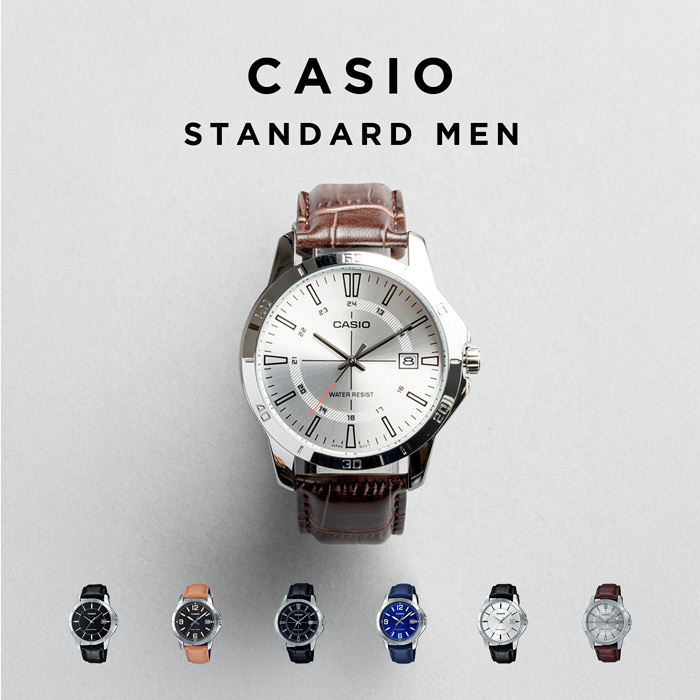 カシオMTP-V004は、メンズサイズの腕時計ですが、女性からの人気も高いモデルです。ビジネス・フォーマル寄りとカジュアル寄りの2系列に分かれているのが特徴です。ビジネス・フォーマル寄りモデルは、ドルフィン針と、サンレイ文字盤の組み合わせ。インデックスを文字盤内周に整列させ、あえて短めの針を選ぶことで、格式高いデザインに仕立てています。クロコダイル風の合皮ベルトもクラシカルです。一方のカジュアル寄りモデルは、バトン針とストライプ文字盤の組み合わせ。アラビア数字と極太バーの混合インデックスがスポーティーで、エッジの効いた針との相性も抜群です。プレーンな合成皮革ベルトが、カジュアルなデザインを引き立てています。 | |