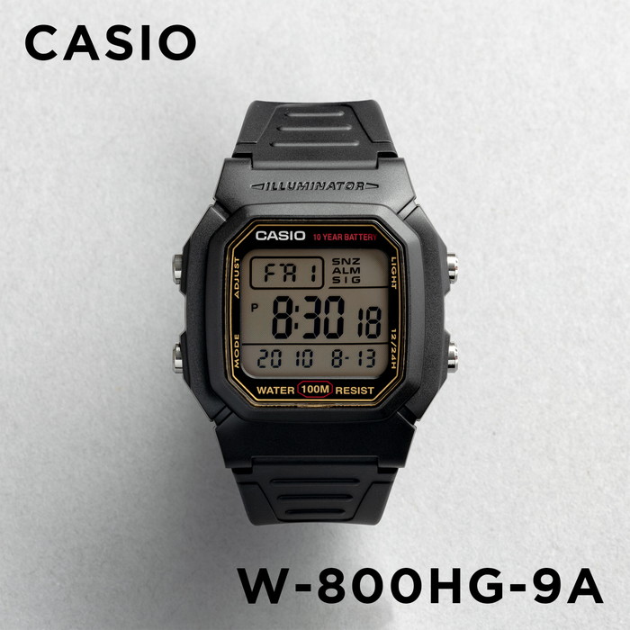 カシオW-800は、ストイックなまでに実用性を追求した、機能美溢れる腕時計です。ディスプレイはベルト幅に迫る勢いの大型サイズで、年月日・曜日・時分秒をフル表示します。直線で構成されたフォントは読みやすいうえ、1と7の誤読防止効果を狙った左縦棒のある「ワ」型の「7」を採用するなど、実用性の高いデザインです。カウントダウンタイマーこそ未搭載ですが、全てのモードで現在時刻が表示されるため、アラームとストップウォッチの併用で代替できます。G-SHOCKの5000 / 5600シリーズに通じる8角形のフォルムには重厚感があり、これぞカシオのデジタルウォッチといった意匠です。 | |