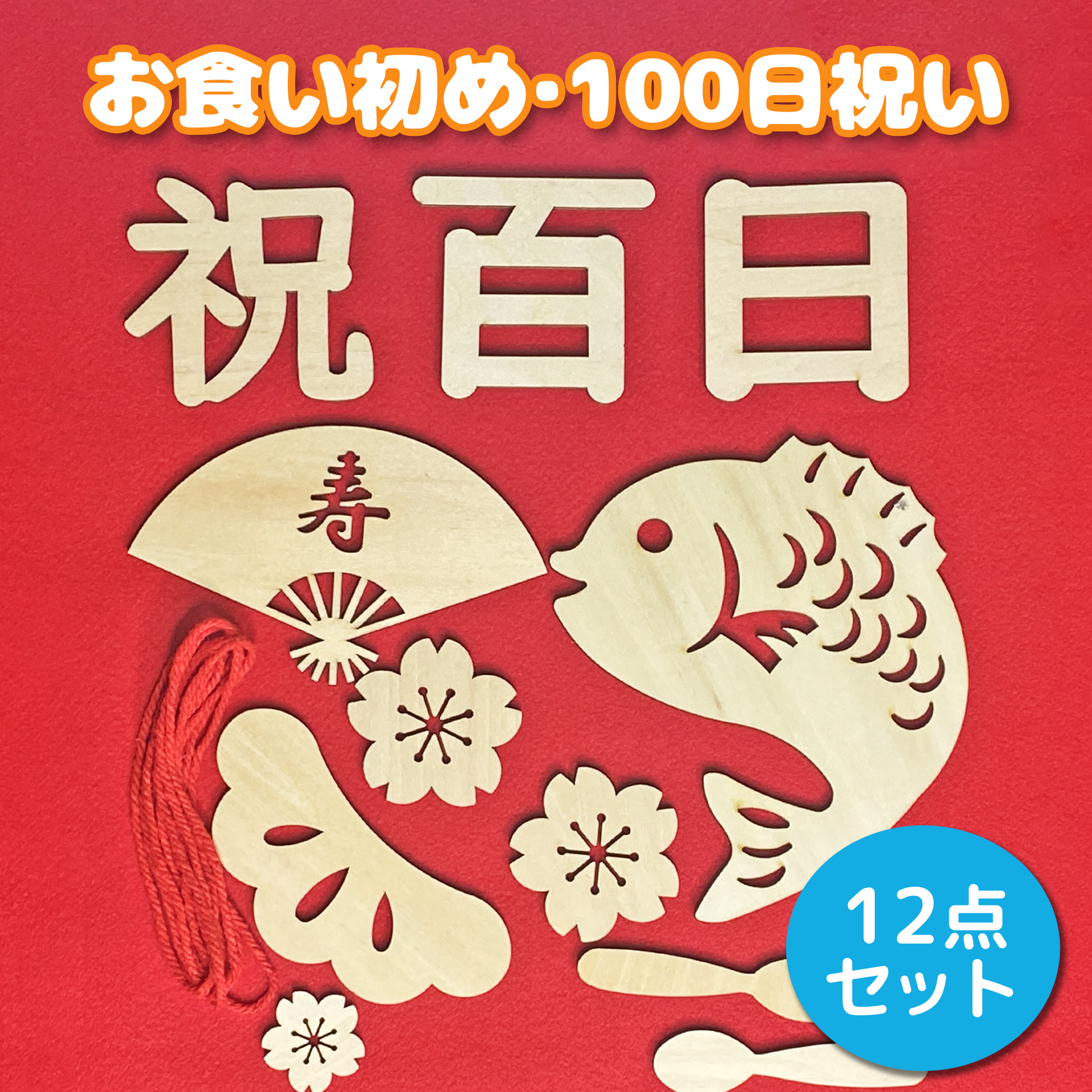 百日の文字やフォーク・スプーンのモチーフが含まれていますので、お食い初めの記念写真にぴったりです。