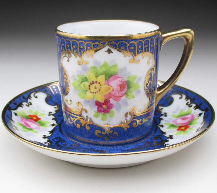 『オールドノリタケ 金彩ブルー地花絵 デミタスカップ&ソーサー』
