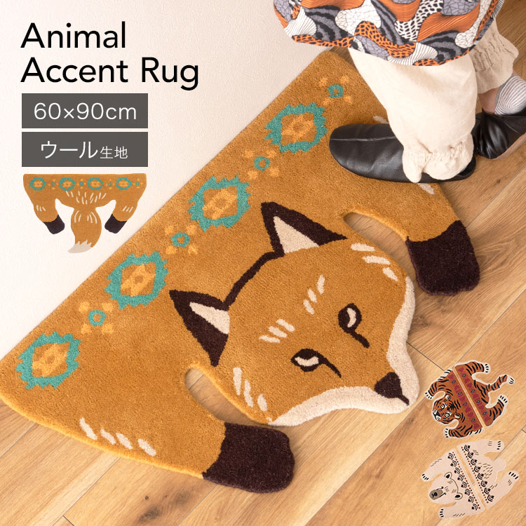 ラグマット 小さい 動物 60×90cm 玄関マット チベタンタイガーラグ トラ 虎 キツネ 狐 クマ 熊 ウール コットン FAB-011