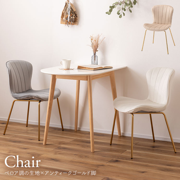 ベロア調の生地とアンティークゴールド脚の組合せが、ガーリーでトレンド感のある雰囲気を演出。身体を包み込むようなフォルムで、デザイン性にプラスして使いやすさにもとことんこだわりました。背・座面共に緩やかなカーブを描いているので、身体にフィットして包み込んでくれます。背面も座面も弾力があり、クッション性もある作りになっているので、座り心地も抜群。生地はベロア調の物を採用。程よく光沢感があり様々な表情を見せ高級感を演出。アンティークゴールドを施した細身の脚がアクセントになり、チェアのデザイン性を引き上げています。