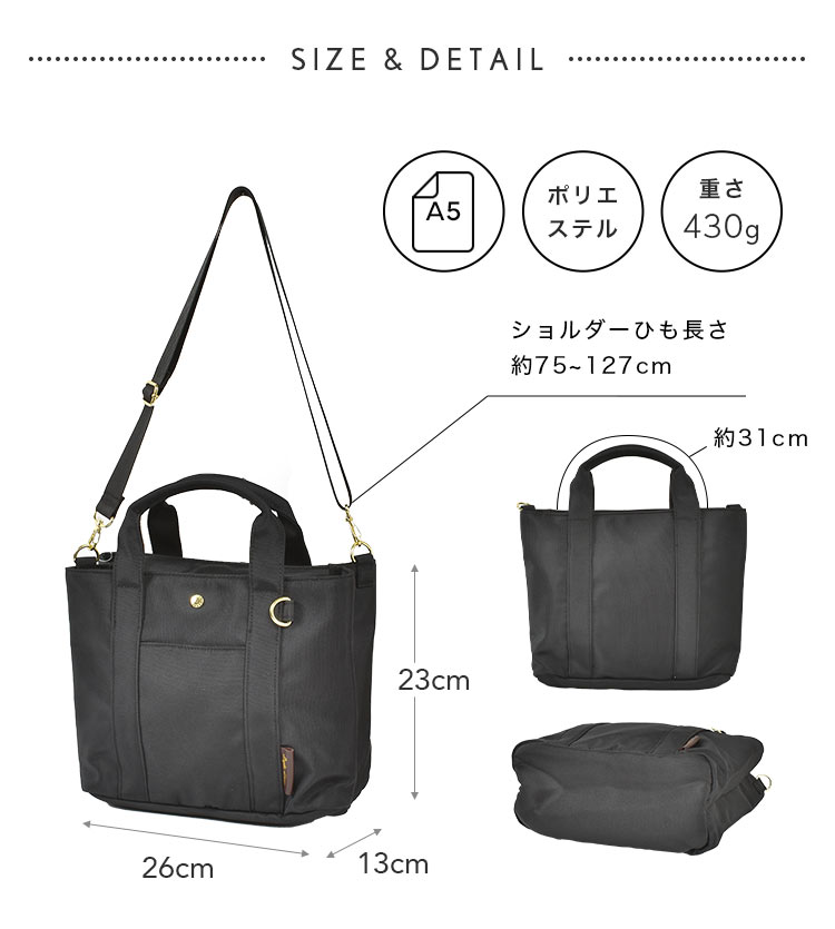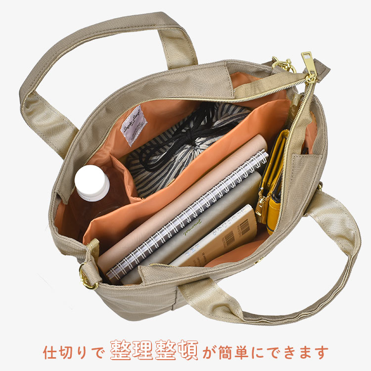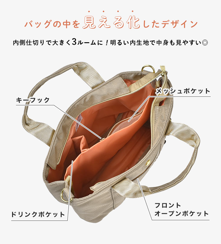 『あれどこいった?時間がないのに見つからない!』を無くしてくれる、かばんの中を見やすくしたデザインの簡探バッグ。撥水加工を施した生地で雨の日も安心して活用いただけます。内側仕切りで大きく3ルームに分けられており、ペットボトルや手帳など分けたいものを簡単に仕分けられます。内生地も明るいので底のものも見えやすいのが嬉しいポイント。
